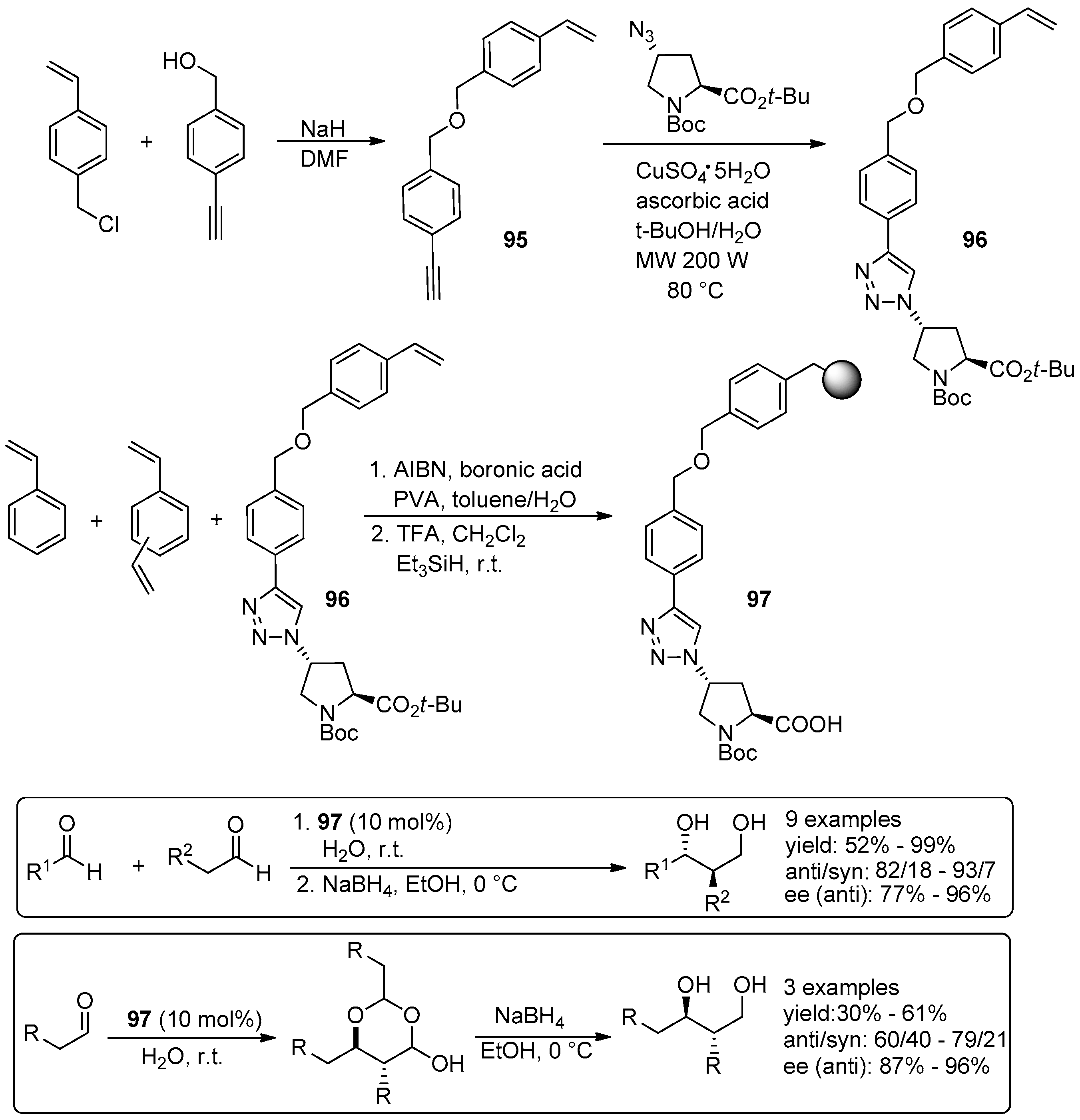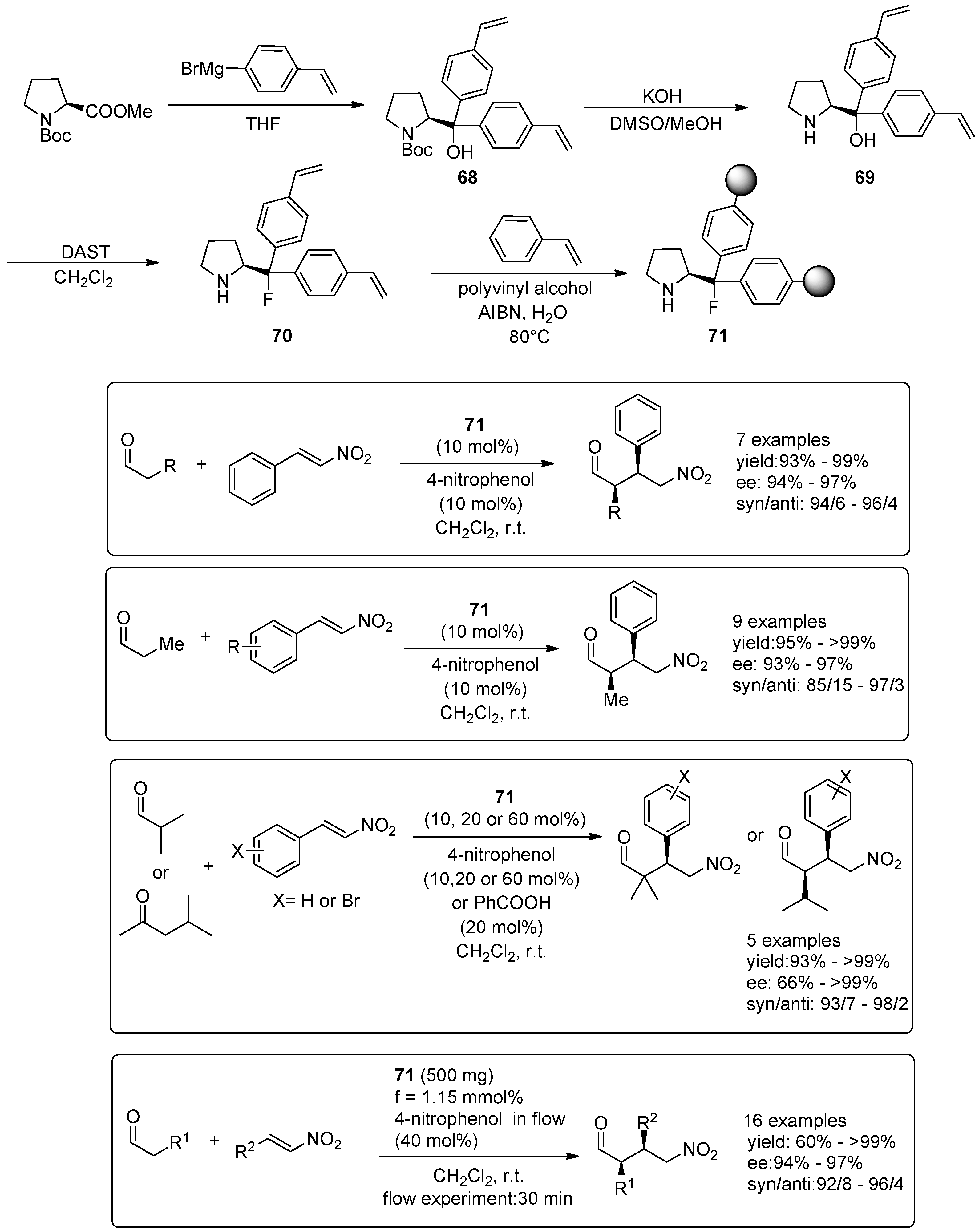 Preparation of supported organocatalysts 62a–f and use of 62e–f in aza-Henry reaction.