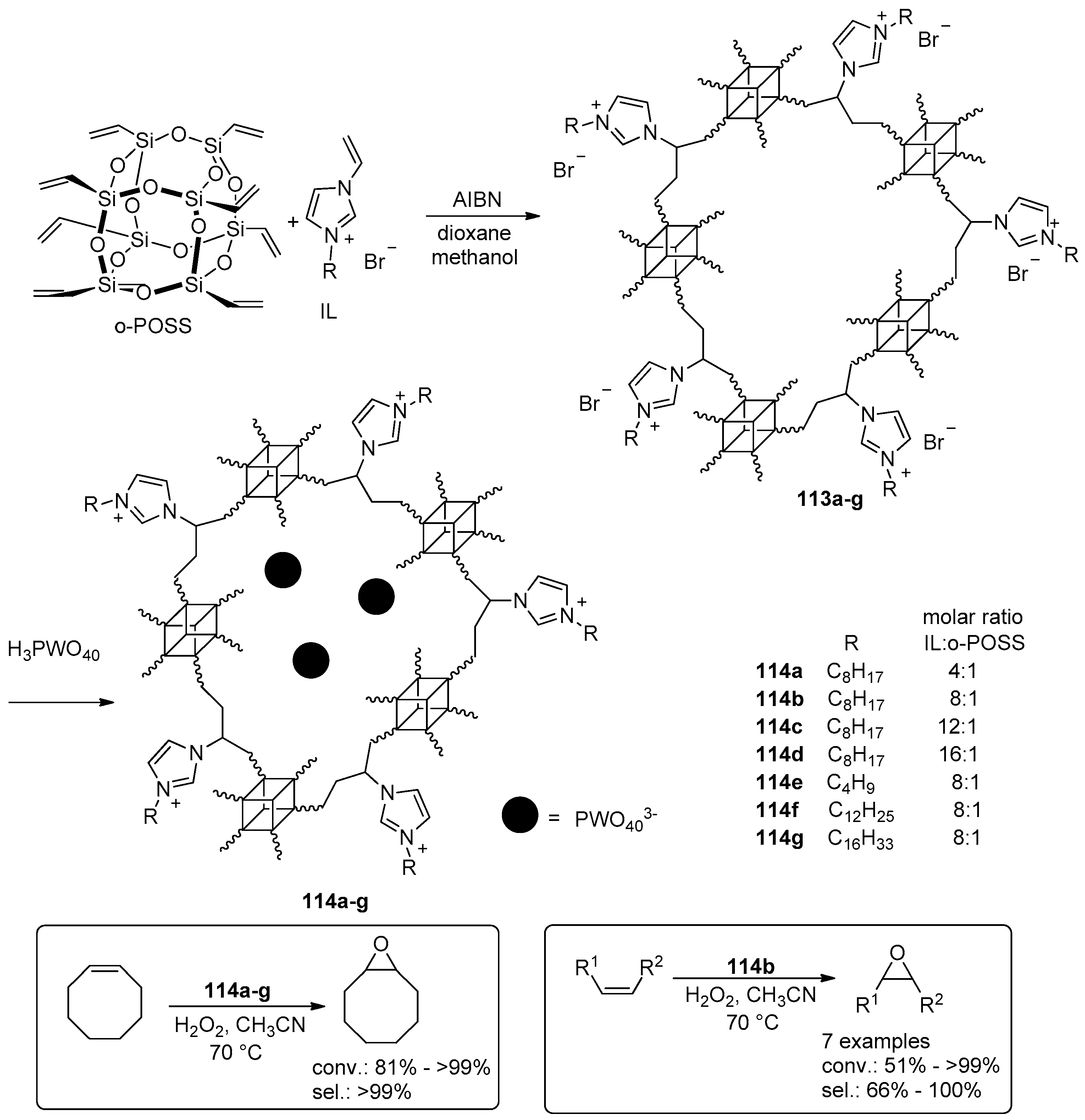 - Zhao, J.; Leng, Y.; Jiang, P.; Wang, J.; Zhang, C. POSS-derived mesoporous ionic copolymer-polyoxometalate catalysts with a surfactant function for epoxidation reactions. New J. Chem. 2016, 40, 1022–1028. [Google Scholar] [CrossRef]