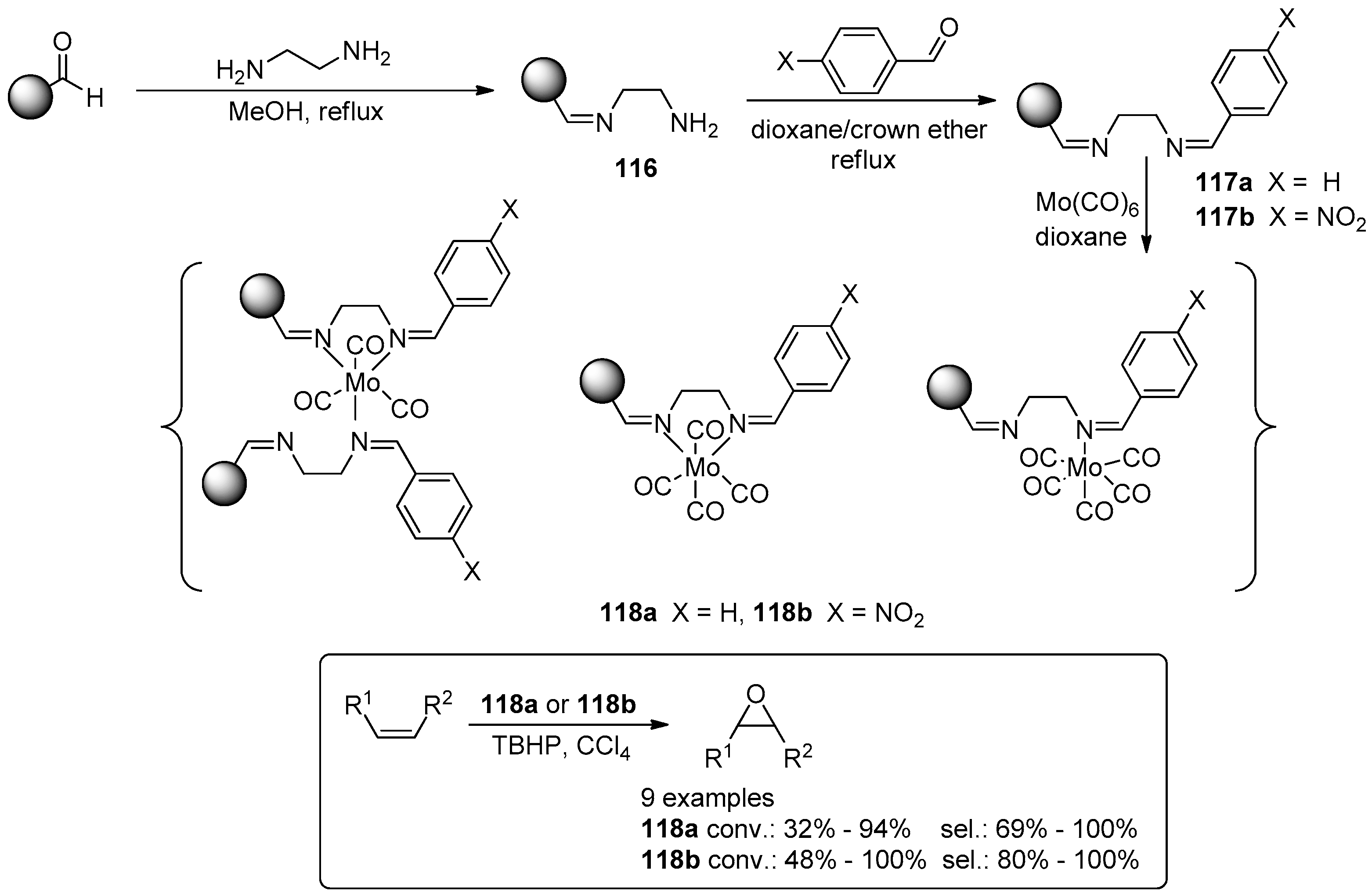 - Grivani, G.; Halili, A. Polymer-supported diimine molybdenum carbonyl complexes as highly reusable and efficient pre-catalysts in epoxidation of alkenes. J. Iran. Chem. Soc. 2014, 11, 163–168. [Google Scholar] [CrossRef]