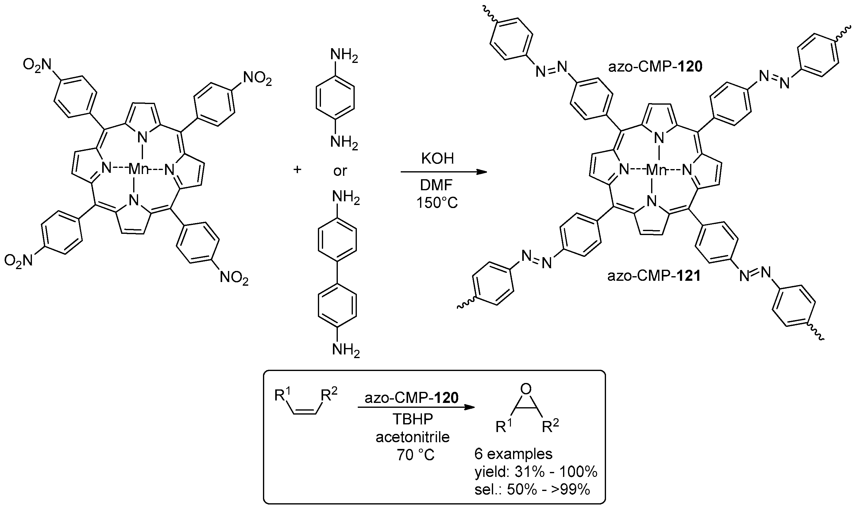 - Zhang, W.; Jiang, P.; Wang, Y.; Zhang, J.; Zhang, P. Directing two azo-bridged covalent metalloporphyrinic polymers as highly efficient catalysts for selective oxidation. Appl. Catal. A Gen. 2015, 489, 117–122. [Google Scholar] [CrossRef]