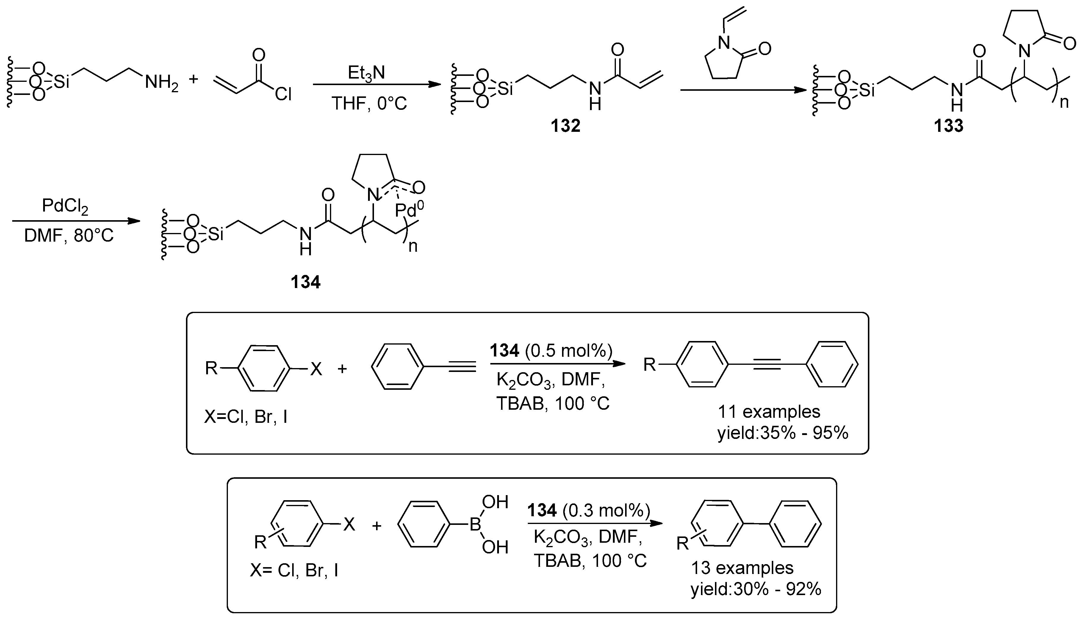 - Tamami, B.; Farjadian, F.; Ghasemi, S.; Allahyari, H.; Mirzadeh, M. Palladium Nanoparticles Supported on Poly(N-vinylpyrrolidone)-Grafted Silica as an Efficient Catalyst for Copper-Free Sonogashira and Suzuki Cross-Coupling Reactions. J. Braz. Chem. Soc. 2015, 26, 1591–1598. [Google Scholar] [CrossRef]
