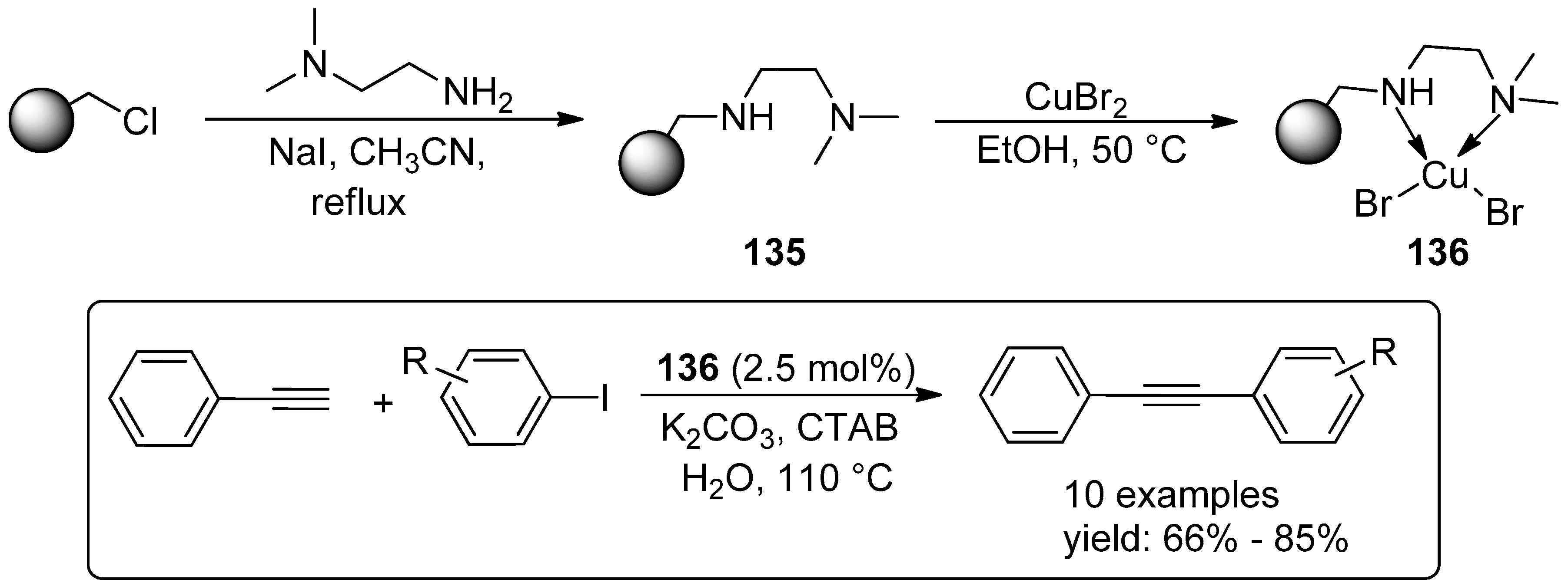 - Kodicherla, B.; Perumgani, C.P.; Mandapati, M.R. A reusable polystyrene-supported copper (II) catalytic system for N-arylation of indoles and Sonogashira coupling reactions in water. Appl. Catal. A Gen. 2014, 483, 110–115. [Google Scholar] [CrossRef]