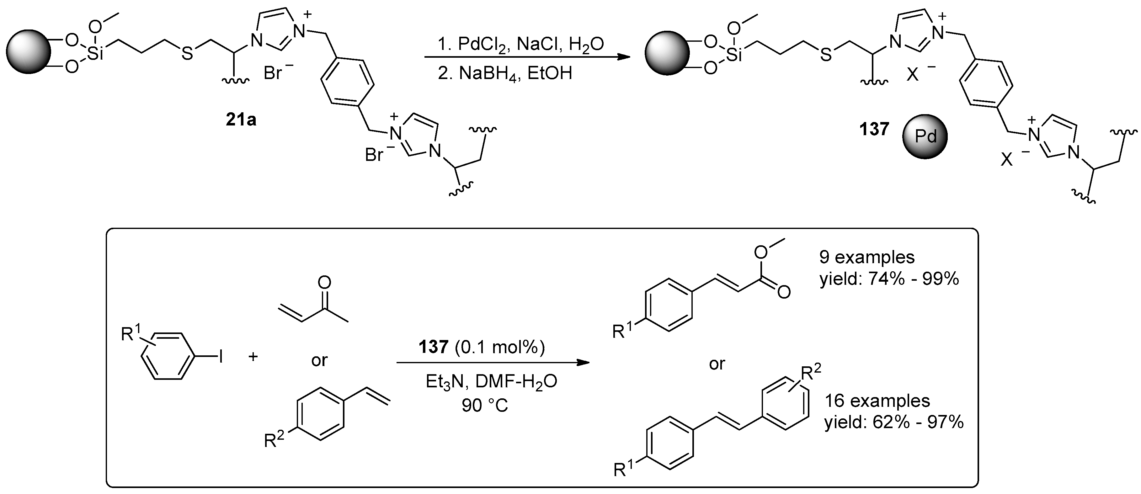 - Pavia, C.; Giacalone, F.; Bivona, L.A.; Salvo, A.M.P.; Petrucci, C.; Strappaveccia, G.; Vaccaro, L.; Aprile, C.; Gruttadauria, M. Evidences of release and catch mechanism in the Heck reaction catalyzed by palladium immobilized on highly cross-linked-supported imidazolium salts. J. Mol. Catal. A Chem. 2014, 387, 57–62. [Google Scholar] [CrossRef]
