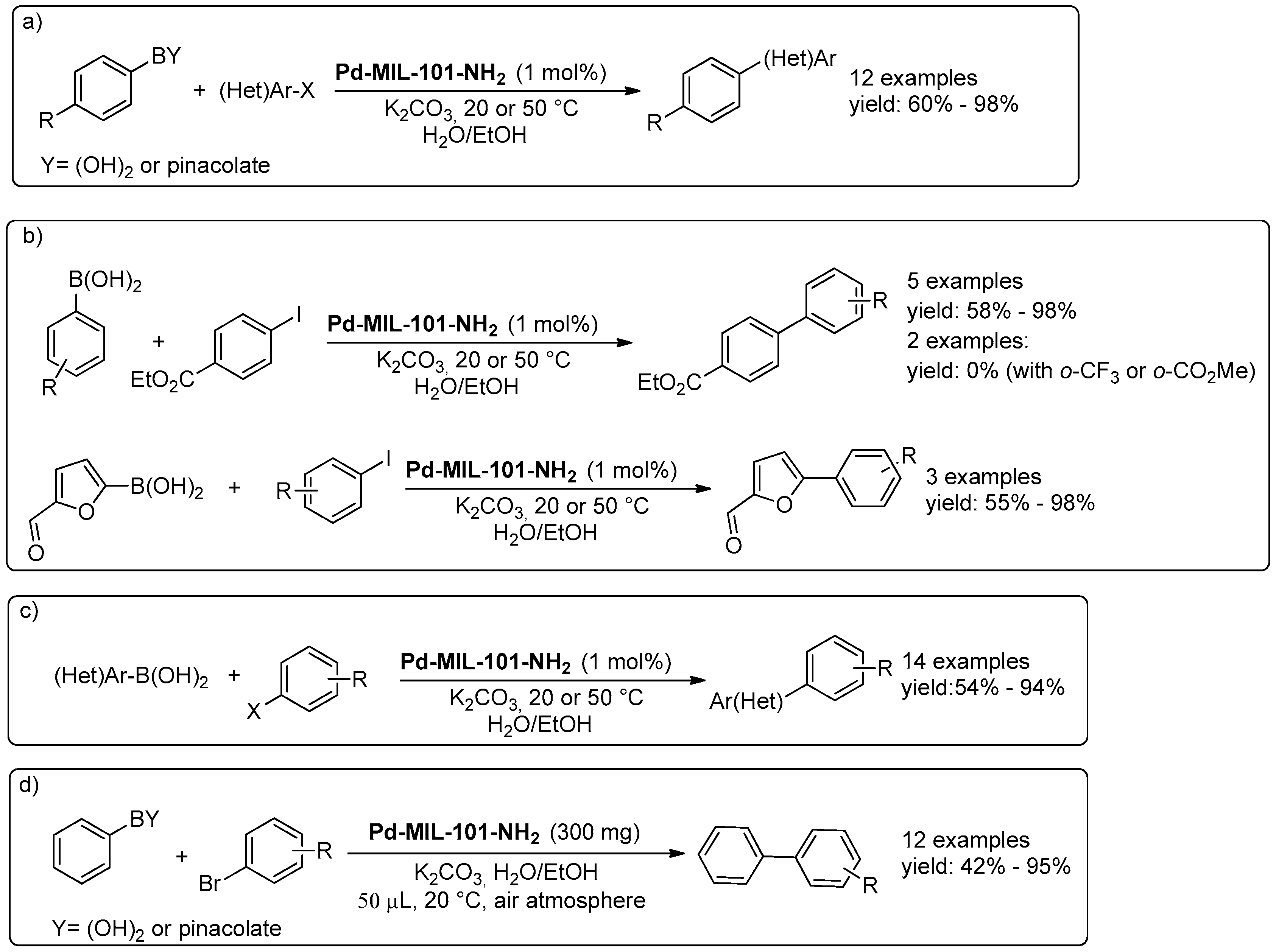 - Pascanu, V.; Yao, Q.; Bermejo Gómez, A.; Gustafsson, M.; Yun, Y.; Wan, W.; Samain, L.; Zou, X.; Martín-Matute, B. Sustainable Catalysis: Rational Pd Loading on MIL-101Cr-NH2 for More Efficient and Recyclable Suzuki–Miyaura Reactions. Chem. Eur. J. 2013, 19, 17483–17493. [Google Scholar] [CrossRef] [PubMed]