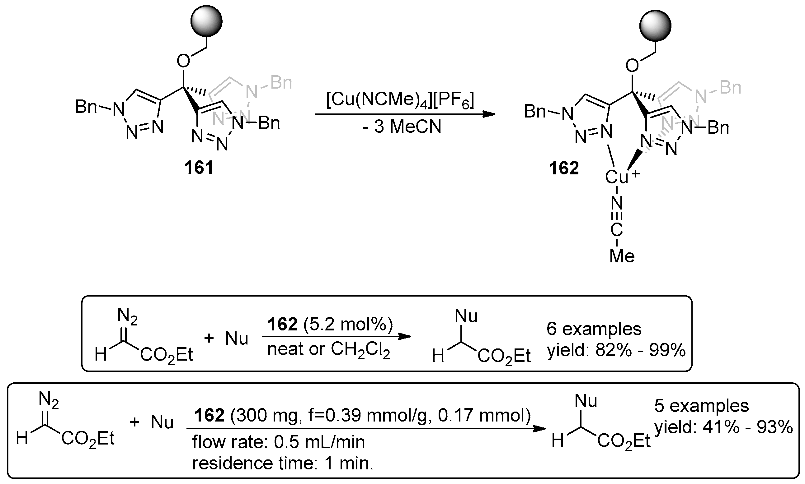 - Maestre, L.; Ozkal, E.; Ayats, C.; Beltran, A.; Diaz-Requejo, M.M.; Perez, P.J.; Pericas, M.A. A fully recyclable heterogenized Cu catalyst for the general carbene transfer reaction in batch and flow. Chem. Sci. 2015, 6, 1510–1515. [Google Scholar] [CrossRef]
