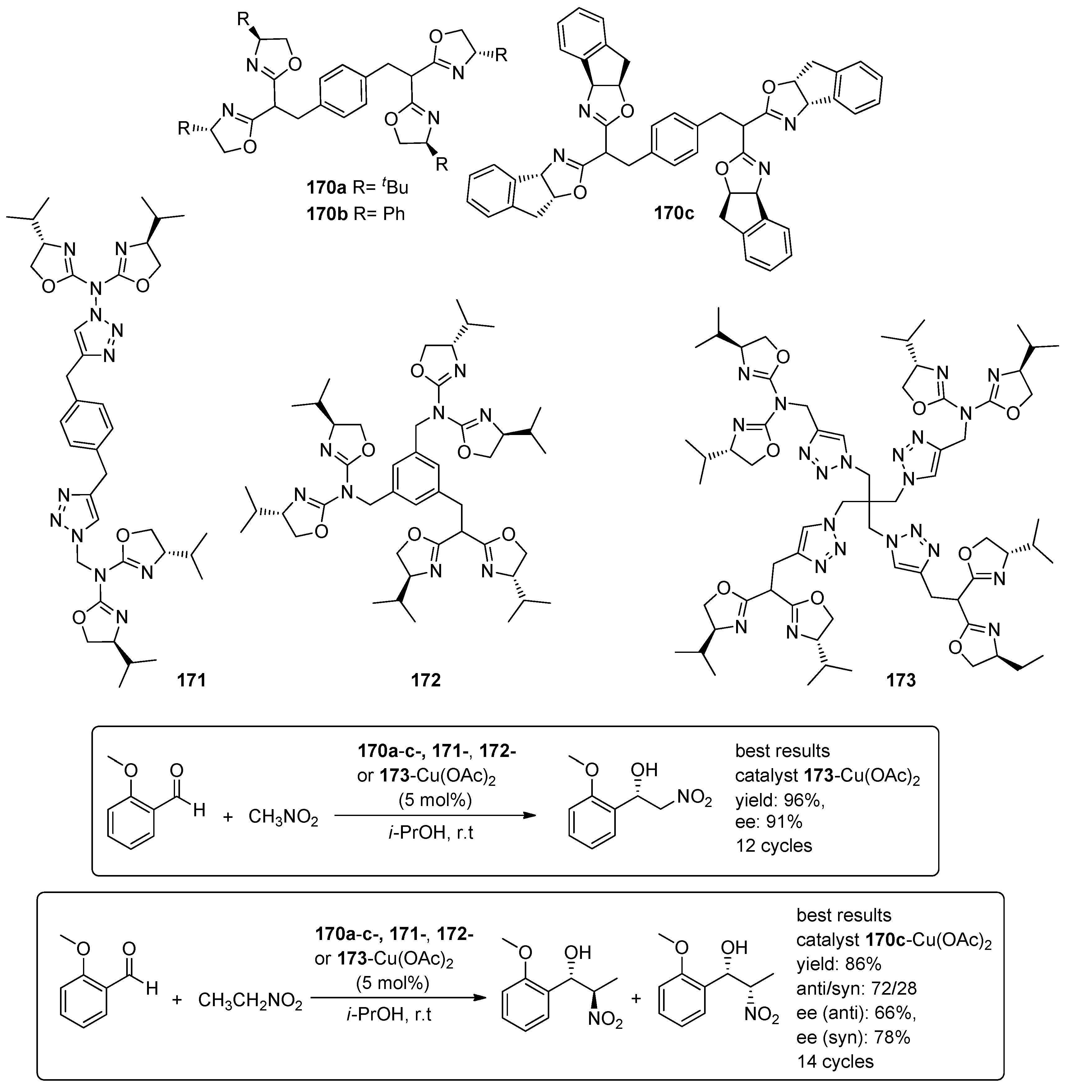 - Angulo, B.; Garcia, J.I.; Herrerias, C.I.; Mayoral, J.A.; Minana, A.C. Polytopic bis(oxazoline)-based ligands for recoverable catalytic systems applied to the enantioselective Henry reaction. Org. Biomol. Chem. 2015, 13, 9314–9322. [Google Scholar] [CrossRef] [PubMed]
