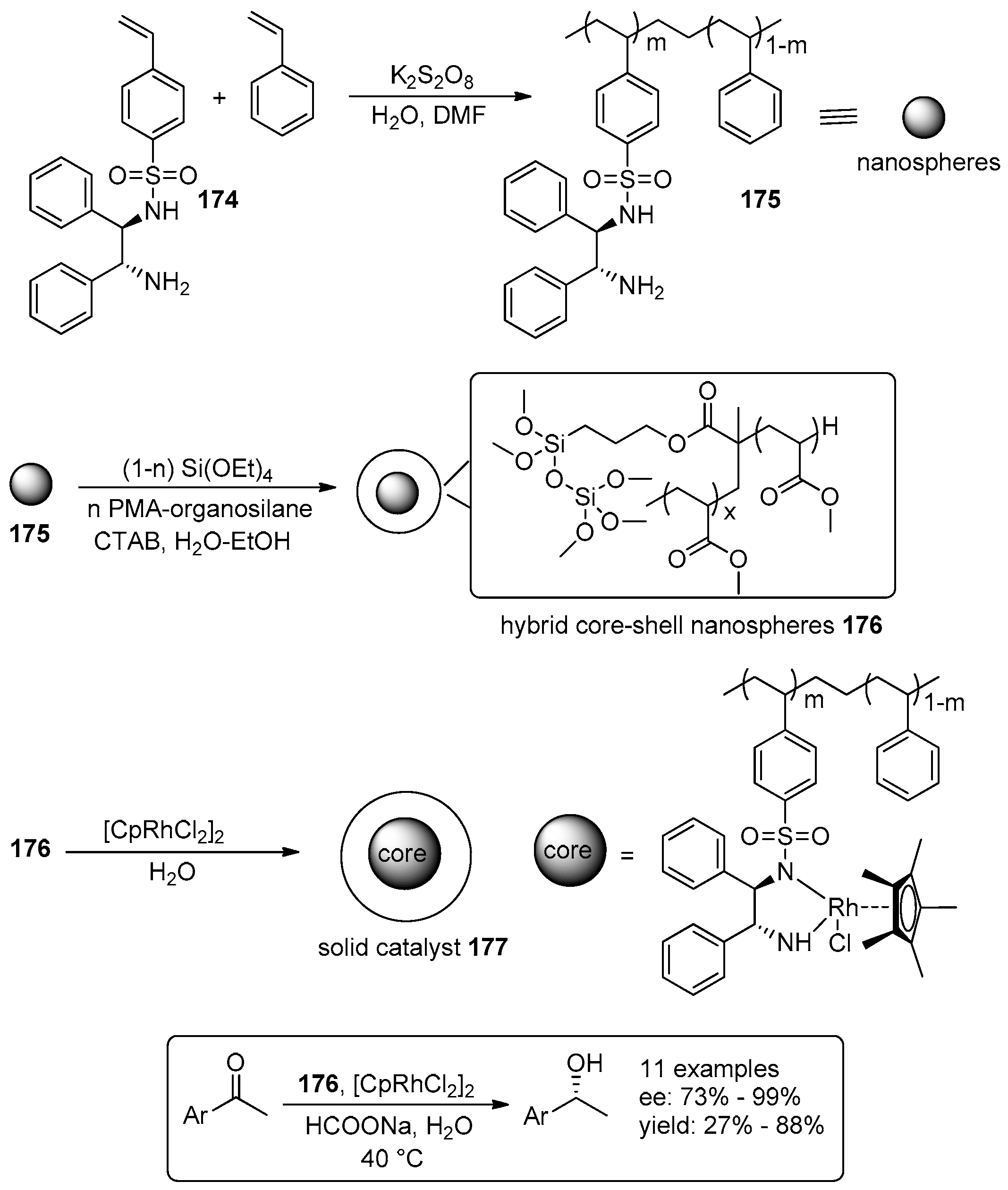 - Wei, J.; Zhang, X.; Zhang, X.; Zhao, Y.; Li, R.; Yang, Q. Facile Synthesis of Hybrid Core–Shell Nanospheres for the Asymmetric Transfer Hydrogenation of Aromatic Ketones. ChemCatChem 2014, 6, 1368–1374. [Google Scholar]