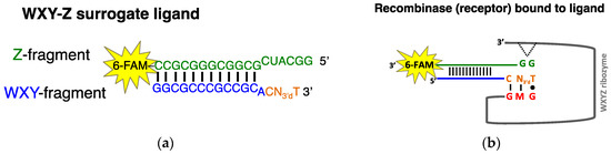 Fluorescence anisotropy ligand and receptor design. (a) Design of the surrogate WXY-Z ligand. The “WXY fragment” (blue) contains the tag (orange) and a 3′ deoxythymidine on the 3′ end prevents catalytic reaction. The “N” nucleotide represents an A, C, G, or C nucleotide. The Z fragment (green) contains the 3’ fluorescent label 6-FAM (6-carboxyfluorescein). The ligand molecular weight is approximately 11 kDa with a Tm = 90 °C; (b) Schematic of the surrogate WXY-Z ligand binding to the WXYZ recombinase ribozyme (receptor) at the IGS (red) and tag (orange) interface. A binding interaction also occurs between the G on the 5’ side of the “Z fragment” and the G-binding site on the ribozyme (indicated by dotted lines). The IGS “M” can represent any of the four nucleotides. The molecular mass of the Azoarcus recombinase ribozyme is approximately 64 kDa; see ref. [] for complete sequence.