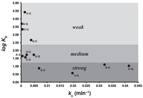 Excluding the four duplexes in which M = G, we correlated the remaining 12 KD values with the autocatalytic self-assembly rate constants obtained previously []. In order to quantitatively determine whether there is a statistically significant correlation between the experimental rate constants and equilibrium constants of the genotype combinations, we performed a two-tailed Spearman’s rank-order correlation test. A significant positive association between the ka and the KD values was detected, with a p value of 0.0057. However, the absolute value of the correlation coefficient for the numerical values of these two parameters, when regressed against each other, is only 0.74. While this value is indeed signficant for the rank orders, it does indicate that triplet binding strength is only one component of catalytic efficacy for ribozyme self-assembly. This suggestion is borne out by the predicted ΔG˚ (48 °C) values for the triplet–triplet base pairs in isolation (Table 1). Here, only the strongest two Watson-Crick pairs (C•G and G•C) in the middle position of the IGS-tag triplet would be predicted to be stable at 48 °C in 100 mM MgCl2 should these trinucleotides be considered alone in solution. The other two Watson-Crick pairs (U•A and A•U), plus the wobble pair U•G should be the next most stable, as expected, followed by every other pair. Yet some of the “poor” catalysts, particularly G•G and A•G (the slowest catalyst), also give ΔG˚ values of the same general order as the U•G pair. This suggests some idiosyncratic trends in the contribution of binding to catalysis, while preserving the general result that Watson-Crick pairs have the strongest binding contribution, followed by U•G, followed by all the others. Three main binding-strength categories can be visualized in a plot of log KD vs. ka (Figure 3).