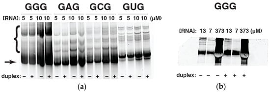 To test our suspicion that excessive complexation of WXY RNA genotypes with M = G is preventing a leveling off of polarization at high concentrations, we ran all four WXY RNA genotypes on a native polyacrylamide gel (one with no urea denaturant and with 5 mM MgCl2 in the running buffer). Significant aggregation can be seen with the GGG genotype; the percentage of slow-migrating RNA species for the GGG, GAG, GCG, and GUG RNAs is 37%, 13%, 15%, and 10%, respectively (Figure 4a). And while the aggregation does not depend on the presence of the duplex, it does become exacerbated as the concentration of the GGG WXY RNA increases (Figure 4b). Thus the WXY RNA fragment with the GGG IGS does tend to nonspecifically aggregate with itself at higher concentrations, perhaps as a consequence of G-quadruplex formation. Accordingly we deemed that this genotype was not suitable for FA experiments, which require measurements of RNA behavior at high concentrations. However RNA self-assembly experiments, performed at lower RNA concentrations in the 0.1–2.0 μM range [,], would not be affected. We also decreased the concentration of MgCl2 to 5 mM, and this does appear to reduce the aggregation phenomenon, as would be expected. While, these conditions are not those under which the self-assembly experiments were reported [], they would tend to minimize polyG interactions.