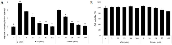 2.2. Effects of K7G and Tilianin on the Expression of Melanogenesis-Related Proteins
