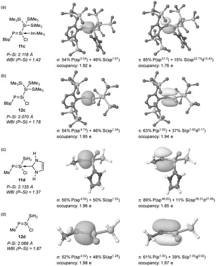 NBO (Natural Bond Orbital) calculations for NHC-coordinated and unligated phosphasilenes. (a,b) B3PW91/6-31+G(d,p)//B3PW91/3-21G(d), (c,d) MP2/6-311G(2d). WBI, Wiberg bond index.