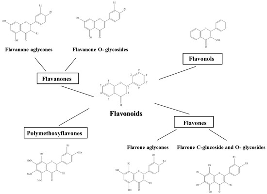 The basic structural feature of flavonoid is 2-phenyl-benzo-γ-pyrane nucleus, contains a C6−C3−C6 heterocyclic skeleton, consisting of two benzene rings linked through a heterocyclic pyran ring. Based on the oxidization of the heterocyclic (C3) ring, Citrus flavonoids can be divided in flavanones, flavonols, flavones, and polymethoxiflavone (Figure 1). Anthocyanins are considered as metabolites of flavones and are present only in blood oranges. Structurally, they derived from pyran or flavan. Flavonoids are mainly present in plants as glycosides, while aglycones (the forms lacking sugar moieties) occur less frequently. Therefore, the large number of flavonoids is a result of many different combinations of aglycones and sugars, mainly d-glucose and l-rhamnose, bounded the hydroxyl group at the C-3 or C-7 position.