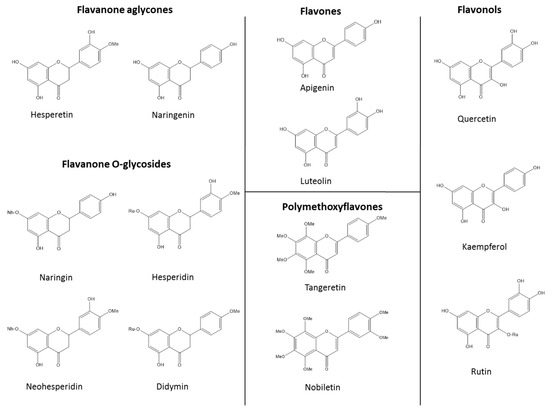 Molecular structure of Citrus flavonoids discussed in this review. Rutinose (Ru), neohesperidose (Nh), methoxy (Me).