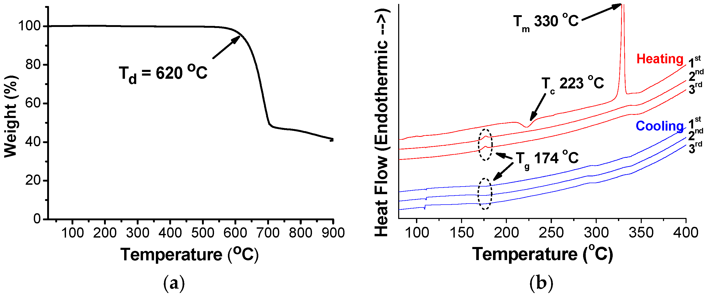 First, as shown in Figure 1, SimCP3 is very thermally stable with a thermal decomposition temperature (Td) as high as 620 °C, where 5% weight loss was determined by thermogravimetric analysis (TGA) under a nitrogen atmosphere. Second, SimCP3 exhibits amorphous or semi-amorphous characteristic based on the thermograms of differential scanning calorimetry (DSC). As shown in Figure 1, SimCP3 has melting temperatures (Tm), crystallization temperatures (Tc), and glass transition temperatures (Tg) of 330, 223, and 174 °C, respectively. Two very weak exothermic signals around 290 and 330 °C may be the inhibited crystallization process of thermally annealed SimCP3. The Tm and Tc of SimCP3 disappeared, and Tg was observed after the first heating scan, indicative of the amorphous tendency of SimCP3.