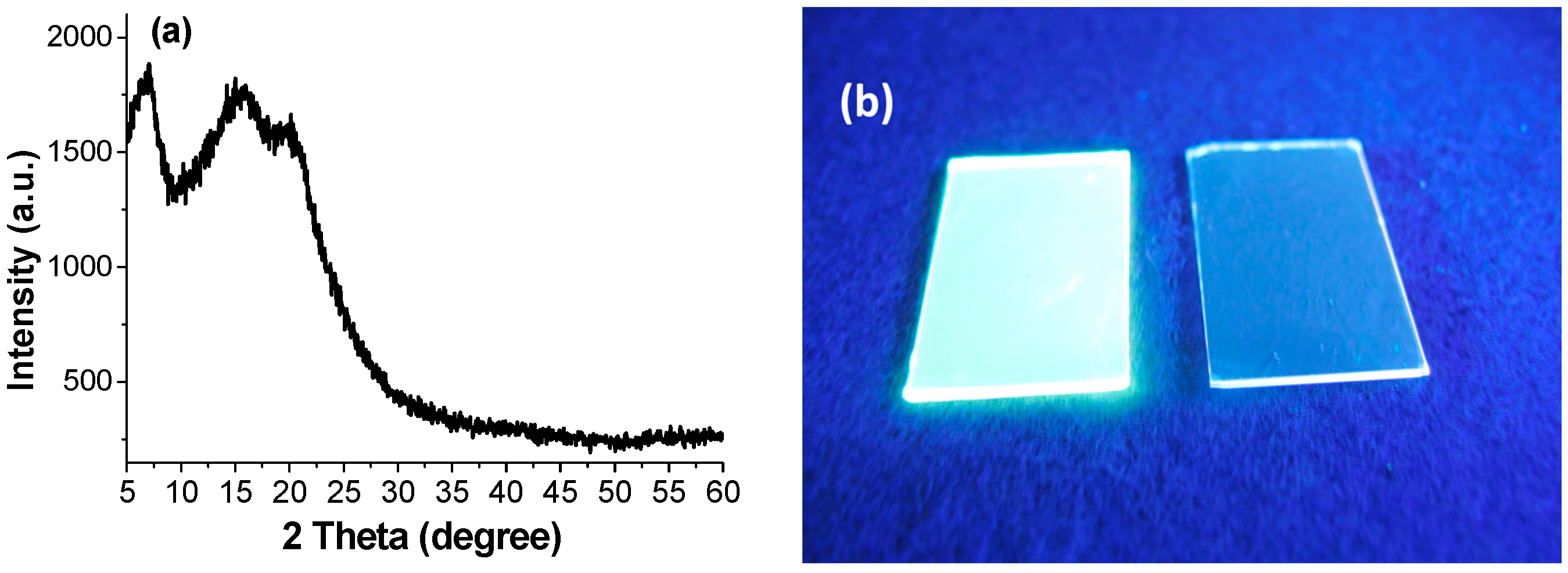 (a) XRD spectra of the solution drop-casting thin film of SimCP3 on silicon wafer; (b) PL images of solution spin-coated thin films of SimCP3: FIrpic (~10 wt %) and SimCP3.
