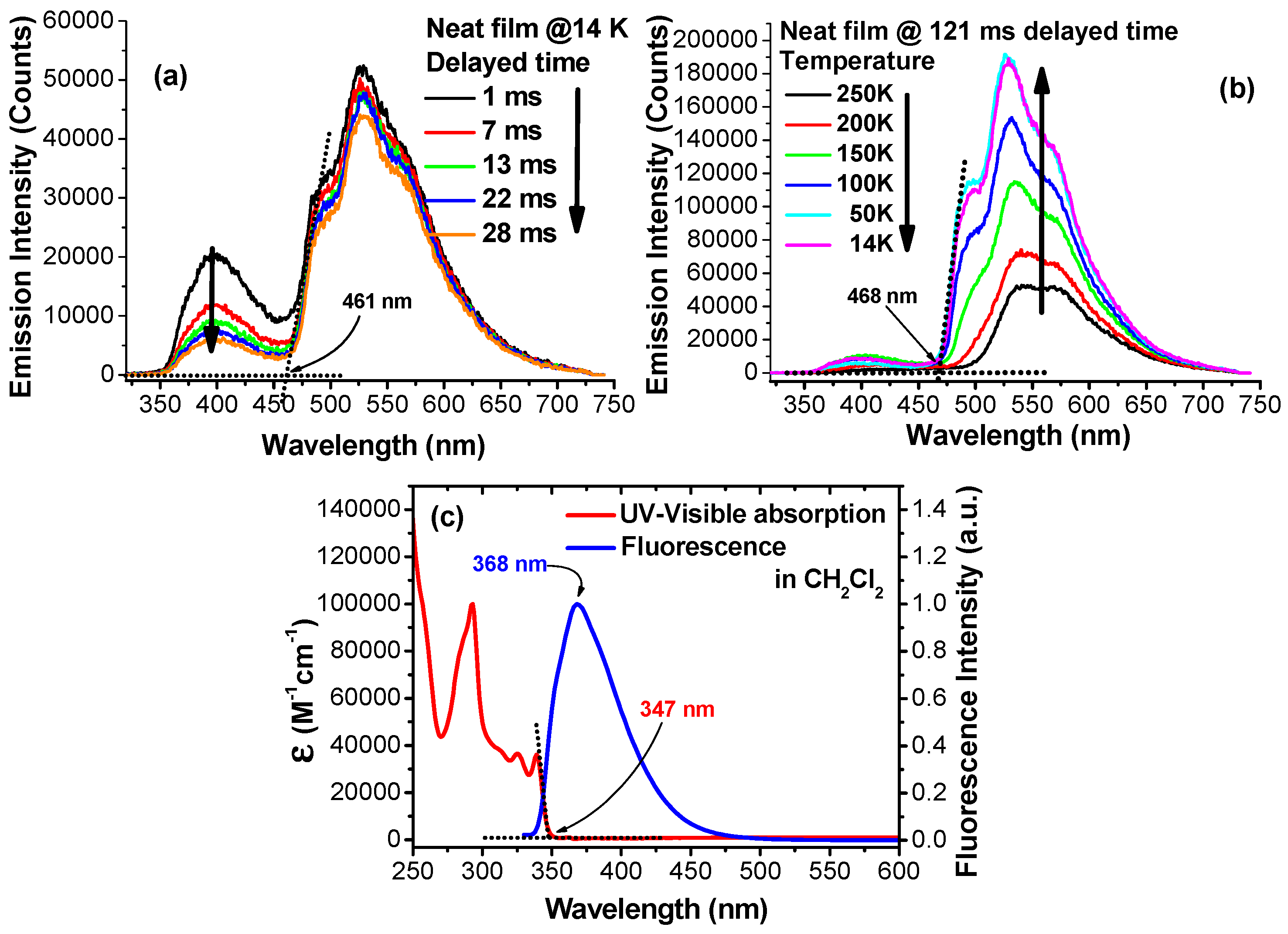 (a) Variable time-gated PL spectra of SimCP3 thin film; (b) Variable temperature, 121 msec time-delayed PL spectra of SimCP3 thin film; (c) Room temperature absorption and PL spectra of SimCP3 in dichloromethane solution.