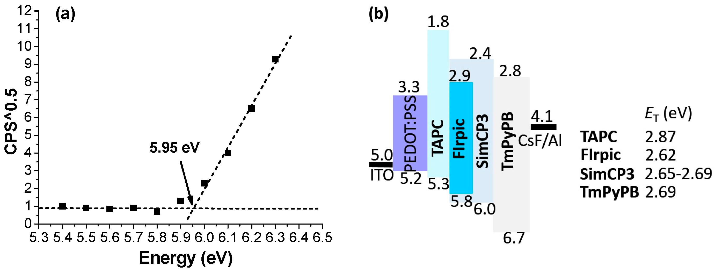 (a) Low-energy photoelectron spectra of SimCP3; (b) Energy level alignment of materials involved in OLEDs.