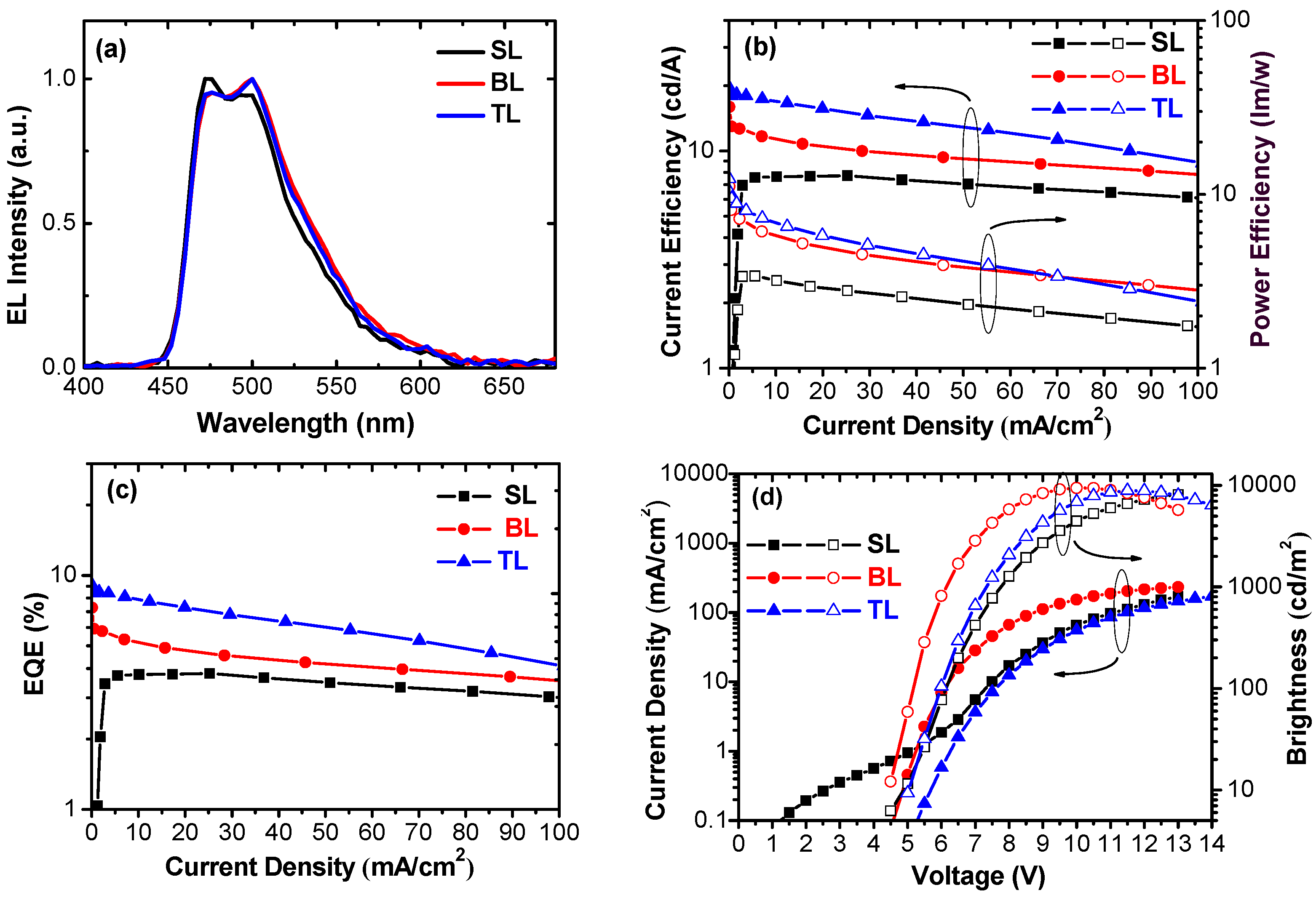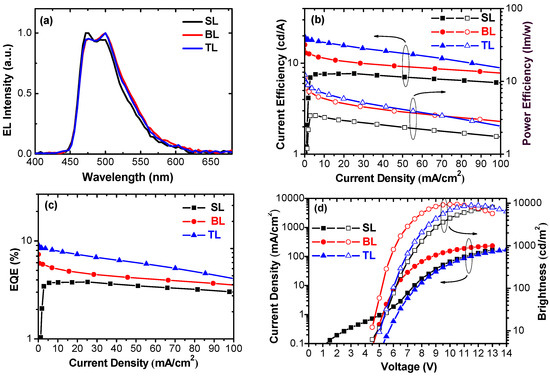 EL characteristics of SL, BL, and TL devices are summarized in Figure 6 and Table 1. All three devices exhibit typical sky-blue emissions of FIrpic with a λmax of ~468 nm, although a variation of emission shoulder band around 500 nm (Figure 6a) was observed. Since both BL and TL devices have a similar intensity of the shoulder band and are both more intense than that of the SL device, it can be logically inferred that TmPyPB effectively blocks the triplet exciton of FIrpic, confining the charge recombination mostly in the SimCP3:FIrpic light-emitting layer (i.e., farther away from the cathode surface) [19]. Therefore, the same reason can be ascribed to the low EL efficiency of the SL device (Figure 6b,c), where the triplet exciton of FIrpic generates in an area too close to the cathode surface and hence is prone to being quenched. Similarly, the TAPC of the TL device plays a role of inhibiting triplet exciton from contacting the anode of the device. Therefore, the EL efficiency of the TL device is promoted further when compared with the BL device. The maximum external quantum efficiency (EQE), current efficiency (CE), and power efficiency (PE) of the TL device are ~9%, ~20 cd/A, and 12 lm/W, respectively. However, the TL device has the lowest current density and the highest turn-on voltage—around 5 V at 1 cd/m2 (see Figure 6d)—among the three devices. This can be attributed to the two exciton blocking layers in the device, which limits the current density and elevates the driving voltage of the device. Nevertheless, all three devices exhibited relatively mild efficiency roll-off. Even at the high brightness of 3000 cd/m2 (about 38, 30, and 19 mA/cm2 of the SL, BL, and TL devices), an EQE of 3.6%, 4.5%, and 7.4% were achieved by the SL, BL, and TL devices, which are 95%, 62%, and 81% of the maximum EL efficiency, respectively (Figure 6c). Compared with those of vacuum-thermal-evaporation OLEDs [2,4], the efficiency roll-off observed for the three devices is relatively modest.