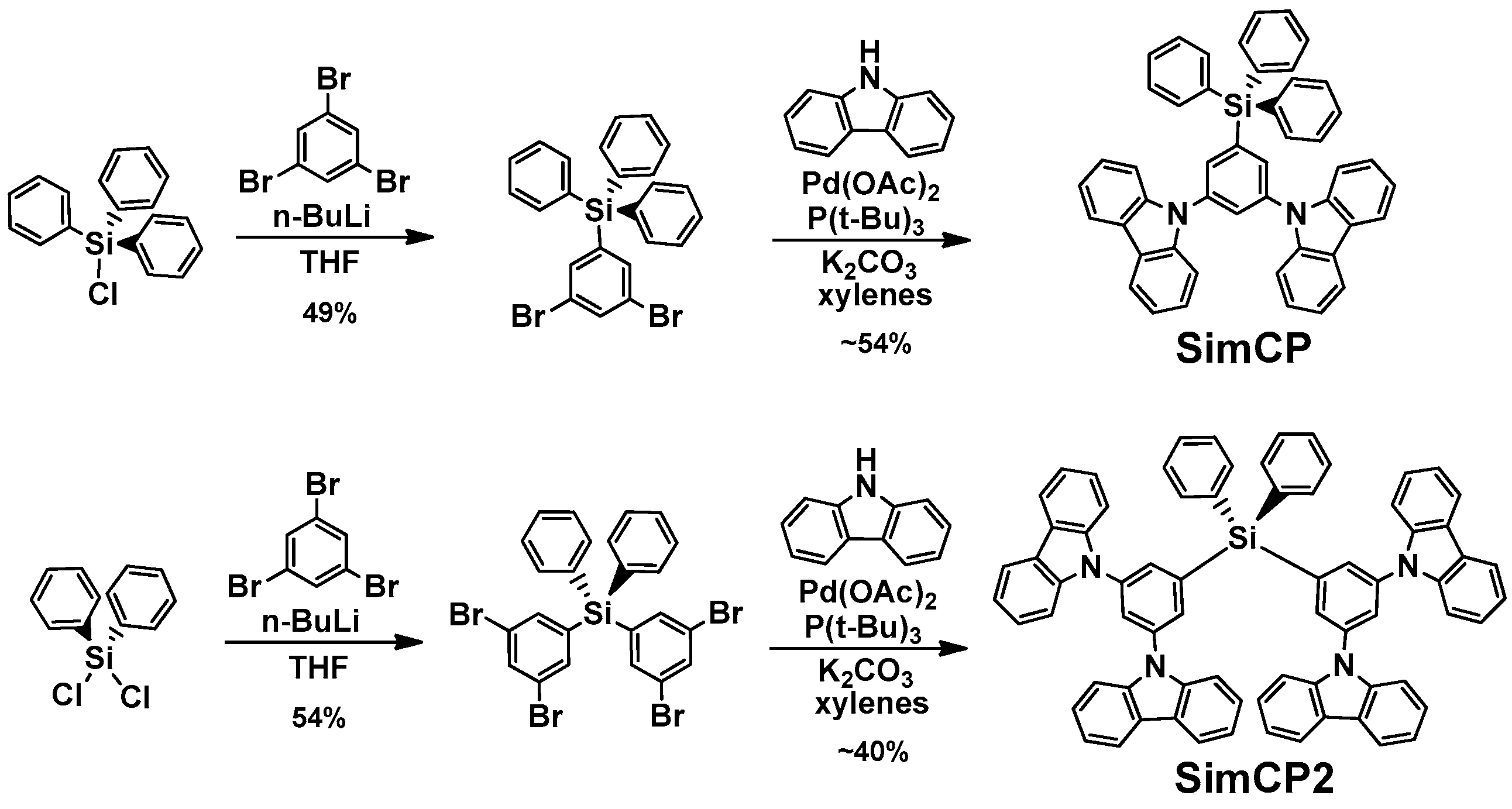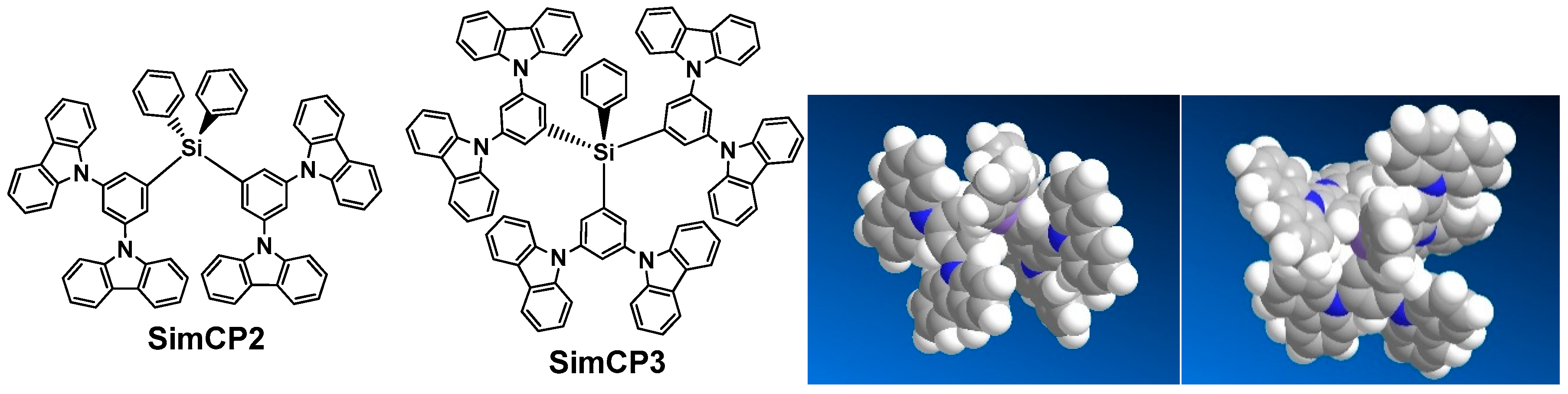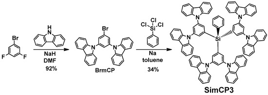 In our earlier reports [16,24,25], both 9,9′-(5-(triphenylsilyl)-1,3-phenylene)bis(9H-carbazole) (SimCP) and SimCP2 were synthesized in a similar method (Scheme 2). Either chlorotripheylsilane or dichlorodiphenylsilane was reacted with monolithiated 1,3,5-tribromobenzene to furnish 1,3-dibromophenyl substituted thriphenylsilane and bis-1,3-dibromophenyl substituted diphenylsilane, respectively. The silane compounds were then brought to a palladium-catalyzed amination reaction with excess amount of carbazole. Both SimCP and SimCP2 were obtained with a reasonable isolation yield of 54% and ~40%, respectively, in the final amination reaction. It is conceivable that the reaction yields will be lower than that of SimCP2 if the higher homologue SimCP3 is prepared by a same reaction sequence shown in Scheme 2.