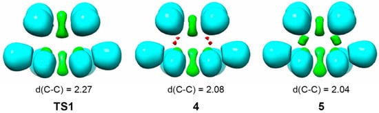 The BET study of the DA reaction between butadiene 1 and ethylene 2 makes it possible to obtain three appealing conclusions [41]: (i) the seven phases characterizing the one-step mechanism permitt to establish that the bonding changes involved in this DA reaction are non-concerted [58], thus ruling out the pericyclic mechanism [59,60]; (ii) ELF topological analysis of the electron density of TS1 shows that there is no bonding region between the C1 and C6, and C4 and C5 atoms (see TS1 in Figure 2) in clear agreement with the electron density distribution of TS1 given in Figure 1; and (iii) the formation of the C–C single bonds takes place after passing TS1 at a C–C distance of 2.04 Å (see 5 in Figure 2) [61].
