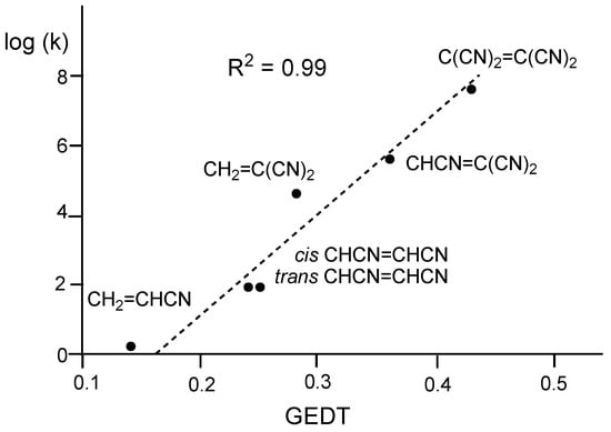 Plot of the logarithm of the experimental rate constant k vs GEDT, in e, for the DA reactions of Cp 6 with the cyanoethylene series 7; R2 = 0.99 [72]. Calculations were performed at the B3LYP/6-31G(d) level.