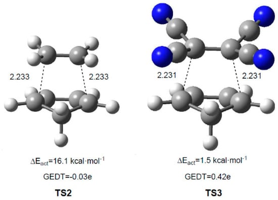 In order to prove how the GEDT reduces the activation energy in polar reactions, the TSs associated with the non-polar DA reaction between Cp 6 and ethylene 2, TS2, and the polar DA reaction between Cp 6 and TCE 9 (7, R1 = R2 = R3 = R4 = CN), TS3, which is the most polar reaction of the cyanoethylene series (see Scheme 2), are analysed. The corresponding activation energies, TS geometries and GEDT at the TSs are given in Figure 4.