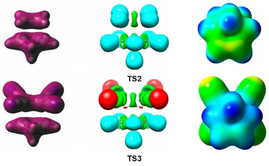 Similar to the non-polar DA reaction between butadiene 1 and ethylene 2, the reaction between Cp 6 and ethylene 2 presents a high activation energy, 16.1 kcal·mol−1. Note that ethylene 2 has been classified as a marginal electrophile and as a marginal nucleophile, not being able to participate in polar processes [69]. On the other hand, TCE 9 is one of the most electrophilic ethylenes [69]. This fact, together with the high nucleophilic character of Cp 6, causes this polar DA reaction not to have an appreciable barrier, 1.5 kcal·mol−1. Consequently, a decrease of ca. 15 kcal·mol−1 is observed in this polar DA reaction. Non-polar TS2 does not present any appreciable GEDT value, −0.03 e, while polar TS3 presents a high GEDT value, 0.42 e. A comparison of the geometrical parameters of these TSs indicates that the lengths of the C–C forming single bonds at both TSs are very similar, 2.233 Å (TS2) and 2.231 Å (TS3). Consequently, it is expected that the distribution of the total electron density in both TSs will be similar, and therefore, they will have a similar bonding pattern.