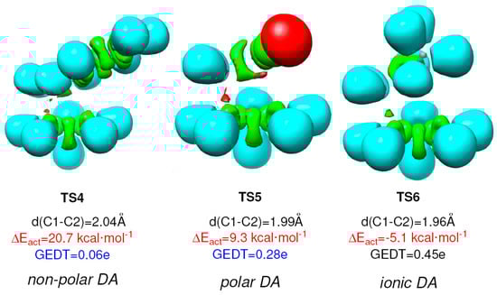 This methodology, which has been applied in recent theoretical studies [61,86,87,88], allows introducing new chemical concepts and reactivity models that make it possible to establish a modern rationalisation and to gain insight into molecular mechanisms and reactivity in Organic Chemistry. Within this MEDT it is important to highlight the useful classification of DA reactions into non-polar, polar and ionic reactions [65]. As can be seen in Figure 6, and as has been commented in Section 4, the increase of the polar character of the DA reaction, i.e., the GEDT, decreases the corresponding activation energy, the nucleophilic/electrophilic interactions at the TSs being the main factor controlling the DA reactions [65]. Figure 6 also shows that while at TS4 and TS5 the C–C single bond is not yet formed, at the more slightly advanced TS6, the formation of the new C–C single bond has already begun [61].