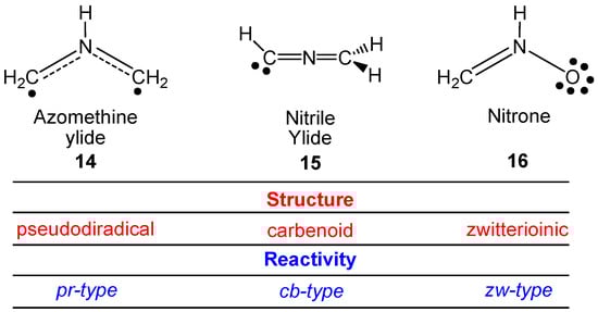 Note that in Huisgen’s seminal study, all TACs, named 1,3-dipoles, were represented by 1,2-zwitterionic structures and the reactions were named 1,3-dipolar cycloadditions [80,93]. However, based on ELF topological analysis and NPA of some TACs, it appears that their structure and reactivity are neither related to 1,3- nor 1,2-zwitterionic species, especially pseudodiradical [81] and carbenoid [91] TACs.