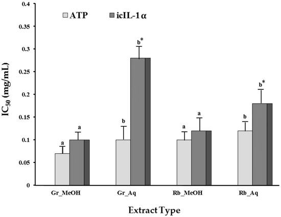 Modulation of cell viability (ATP content) and icIL-1α accumulation by green tea and rooibos tea in relation to their respective IC50 concentrations. Values are means of duplicate determinations with five repetitions each. Different letters implies significant (p < 0.05) differences between the means of the methanol and aqueous extracts within the selected parameter, respectively. Means between * Gr_MeOH and Rb_MeOH (IL-1α) and # Gr_MeOH and RB_MeOH (ATP) differ significantly (p < 0.05). Abbreviations: Gr—green tea; Rb—rooibos; Aq—water; MeOH—methanol.