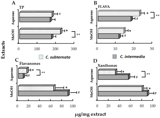 Quantitative levels of: (A) TP (total polyphenol); (B) FLAVA (flavanol/proanthocyanidin); (C) flavanone (hesperidin, eriocitrin and eriodictyol-glycoside); and (D) xanthones (mangiferin and isomangiferin) content of the methanol (MeOH) and aqueous (Aq) extracts of C. subternata and C. intermedia. Values represent means of triplicate determinations. *,# Means of methanol and aqueous extracts of a Cyclopia species differ significantly (p < 0.05). ** Significant (p < 0.05) species differences. Data derived from [24].