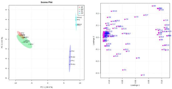 Principal component analysis (PCA) of goji berry fermented wine made of fresh and dried goji berry under pressing and glycosidase treatment. Left—Scores plot; Right—Loading plot; Volatiles with abbreviation of A1-O8 in loading plot are named in Table 3. “1”, “2” in scores plot represent two replicates for each goji berry fruit wine fermentation treatment.