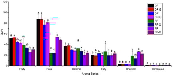 The volatile compounds were divided into six aromatic groups regarding their odor description [,,,]. These volatile compounds were described to possess: (1) fatty, (2) caramel, (3) fruity, (4) herbaceous (or vegetal), (5) floral, and (6) chemical odors. The total aroma intensity of each aroma group was calculated by summing up the OAVs of each volatile in the group [].