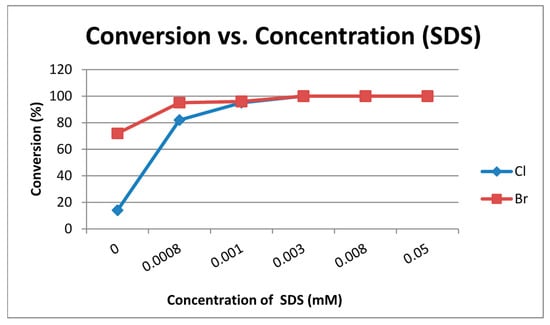 In order to improve the efficiency of this transformation, in the continuation of our work we tested if the addition of a surfactant had an effect on the course of the reaction. We chose sodium dodecyl sulfate (SDS) as the amphiphilic surfactant and reactions were performed with different surfactant concentrations in the aqueous media. Results are given in Table 3. The influence of the concentration of amphiphile on conversion of 1,1-diphenylethanol (1) in water with NCS and NBS is graphically presented in Figure 1 and it could be established that the catalytic effect of SDS amphiphile in the case of NCS and NBS-mediated reaction, reached its maximum efficiency at a concentration of 3 mM or higher. It was found that the choice of surfactant had a significant influence on the yield and the reaction time; namely, the addition of SDS increases the yields and reduces the reaction times.