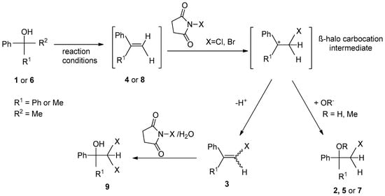 On the basis of the presented results we could propose a plausible reaction pathway for the transformation of phenyl-alkyl substituted tertiary alcohols to vicinal halohydrins using N-halosuccinimides as the halogenating reagents (Scheme 2). We suppose that the first step of the reaction is the dehydration of the alcohol under the described reaction conditions, thus forming the corresponding alkene; in our case 1,1-diphenylethene (4) or 2-phenylpropyl-1-ene (8), as observed among the products in the isolated crude reaction mixtures. A certain degree of protic conditions are necessary for this first step, since in aprotic solvents no reaction was observed (Table 1, entries 1–4), while the addition of water to aprotic EtOAc readily resulted in dehydration of the alcohol (Table 1, entries 5 and 6). The second step should be the halogenation of the alkene with NXS reagents, known as the halogene-transfer reagents, to electron-rich unsaturated organic compounds following the electrophilic process which includes the formation of the most stable β-halosubstituted carbocation intermediates. These intermediates could lose a proton and result in the formation of halogen-substituted alkenes, 3 or, in the presence of a sufficient concentration of hydroxy or methoxy nucleophile, it could collapse with them, thus forming vicinal halohydrins, 2 and 7 or halomethoxy analoques 5 respectively. In the cases of performing reactions of 1,1-diphenyl ethanol in water, the formation of vicinal dihalohydrins 9 were also observed in approximately 10% relative yield. The formation of dihalohydins is the consequence of further halohydroxy transformation of the addition-elimination product 3.