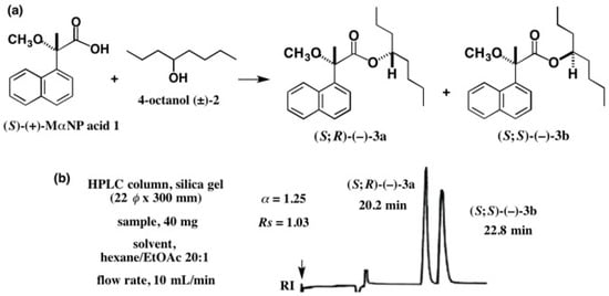 It is well known that the so-called chiral high performance liquid chromatography (HPLC) method, i.e., HPLC with a chiral stationary phase, is very useful for the separation of enantiomers, i.e., the preparation of enantiopure compounds [1,2,3,4,5], as will be explained in other review articles and/or research papers reported in this Special Issue. On the other hand, there is another HPLC method for the preparation of enantiopure compounds, where diastereomers are separated by normal HPLC on silica gel [6,7,8,9,10,11], or by reversed-phase HPLC [12]. For example, racemic 4-octanol (±)-2 was esterified with (S)-(+)-2-methoxy-2-(1-naphthyl)propionic acid 1 (MαNP acid) yielding a diastereomeric mixture of esters 3a and 3b (Figure 1) [13]. It was surprising to find that diastereomeric esters 3a and 3b (40 mg sample) could be completely separated by HPLC on silica gel (separation factor α = 1.25; resolution factor Rs = 1.03), regardless of the very small chirality of the 4-octanol moiety, which is generated by the difference between propyl (C3) and butyl (C4) groups; especially since both are normal chain alkyl groups. Please note that in this review article, the diastereomers are designated by compound numbers., e.g., 3a and 3b, where small letter a indicates the first-eluted fraction in HPLC, and b is the second-eluted one.