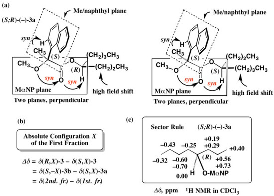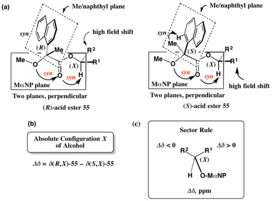 Another relative method is the 1H-NMR diamagnetic anisotropy method, that is explained in Figure 3 [13]. The first-eluted MαNP ester (−)-3a and the second-eluted ester (−)-3b take the preferred conformations as shown in Figure 3a. In ester (−)-3a, the propyl group is located above the naphthyl group plane, and hence the protons of the propyl group feel the diamagnetic anisotropy effect leading to a high-field shift. On the other hand, in ester (−)-3b, the butyl group protons are placed above the naphthalene ring, leading to a high-field shift. The diamagnetic anisotropy effect (∆δ) is defined as shown in Figure 3b, where X is the AC of the first-eluted ester (−)-3a to be determined. The ∆δ values were calculated from the observed 1H-NMR spectra as shown in Figure 3c, where the propyl group showing positive ∆δ values is placed on the right side, while the butyl group giving negative ∆δ values is placed on the left side. By applying the present sector rule, the AC of the first-eluted MαNP ester (−)-3a was determined to be (R) [13].
