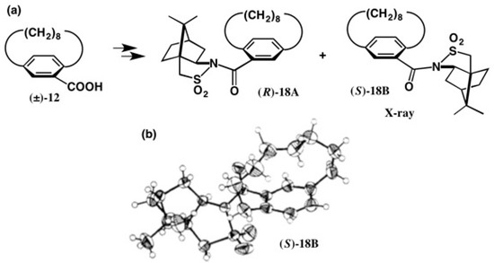 Next, the camphorsultam method was applied to [8]paracyclophane-10-carboxylic acid 12. Racemic acid (±)-12 was converted to diastereomeric amides 18A and 18B (Figure 14), which were subjected to HPLC, but unfortunately the amides could not be separated. (Please note that in compounds 18A and 18B, the capital letters A and B do not indicate HPLC elution order, just meaning two diastereomers). So, the fractional recrystallization from MeOH was applied, giving amide 18B as plate single crystals suitable for X-ray crystallography. The ORTEP drawing of amide 18B was obtained as shown in Figure 14b. The (S)-AC of 18B was determined by the heavy atom effect (R = 0.0441 for the real image and R = 0.0538 for its mirror image). This assignment was also corroborated by the internal reference method of camphorsultam [30].