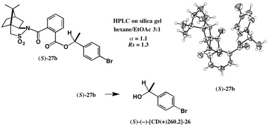 Preparation and HPLC separation of esters 27a and 27b, and the AC determination of ester (S)-27b by X-ray analysis. From ester (S)-27b, alcohol (S)-(−)-26 was obtained. ORTEP drawing, reprinted from [31].