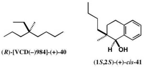 - Fujita, T.; Obata, K.; Kuwahara, S.; Nakahashi, A.; Monde, K.; Decatur, J.; Harada, N. (R)-(+)- [VCD(−)984]-4-Ethyl-4-methyloctane, a Cryptochiral Hydrocarbon with a Quaternary Chirality Center. (1) Synthesis of Enantiopure Compound and Unambiguous Determination of Absolute Configuration. Eur. J. Org. Chem. 2010, 2010, 6372–6384. [Google Scholar] [CrossRef]