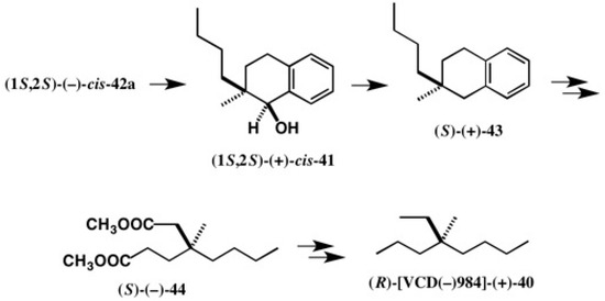 Racemic alcohol (±)-35 was esterified with CSDP acid (−)-23, yielding diastereomeric CSDP esters. However, the diastereomeric esters appeared as a single peak in HPLC on silica gel; they could not be separated at all. So, we have tested some synthetic precursors of alcohol 35, but all attempts were unsuccessful. Finally, we have found that diol 36 (Figure 23) could be separated as CSDP esters as shown in Figure 24 [41].