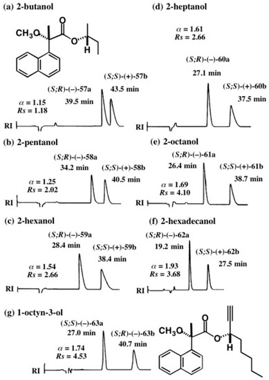 In general, it is very difficult to separate enantiomers or diastereomers composed of C, H, and O atoms by HPLC or gas chromatography (GC), especially in the case of aliphatic chain compounds. For example, Figure 2 shows the separation results of 4-octanol or 4-nonanol, reported to date: (a) a racemic 4-octanol 3,5-DNPU (3,5-dinitrophenylurethane) derivative was subjected to chiral HPLC at −20 °C, but the separation factor α remained low as α = 1.06 [14]; (b) separation of racemic 4-nonanol acetate was attempted by chiral GC, but this was not successful, α = 1.0~1.01 [15]; (c) racemic 4-octanol was esterified with a chiral acid yielding diastereomers, which were separated by HPLC (reversed phase) at −40 °C, but α remained low as α = 1.04 [16].