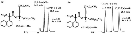 Analytical HPLC of saturated long chain alcohols MαNP esters: silica gel column (10 φ × 300 mm, n = 34,400); sample (0.1 mg); detected by UV. (a) hexane/EtOAc 80:1; (b) hexane/EtOAc 150:1. Redrawn with permission from [13].