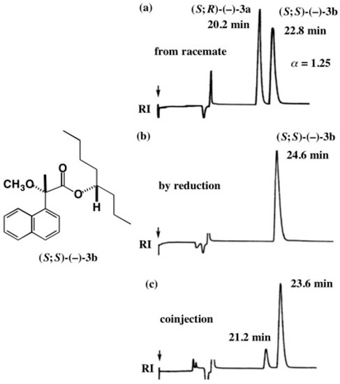 Figure 52a shows the HPLC of esters (S;R)-(−)-3a and (S;S)-(−)-3b prepared from racemic 4-octanol (±)-2; the part (b) shows the HPLC of ester (S;S)-(−)-3b obtained by reduction of ester (S;S)-(−)-70a; the part (c) shows the coinjection of two samples used in (a) and (b). The HPLC (b) shows only one band indicating that the product was diastereomerically pure, and hence it was concluded that no racemization occurred during the catalytic reduction of the acetylene alcohol MαNP ester [13].
