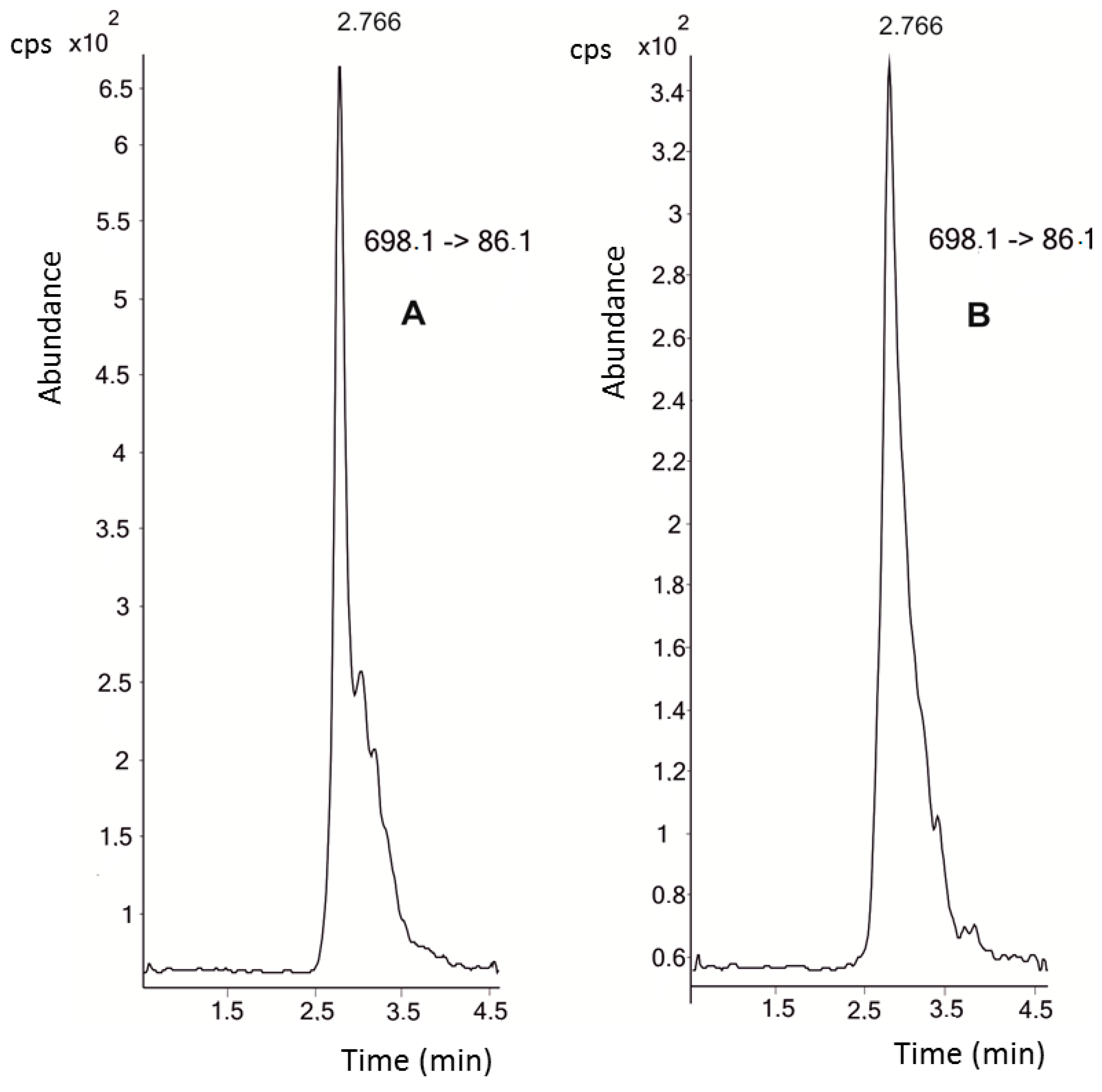 The mass spectrometry (MS) analysis was performed in the multiple reaction monitoring (MRM) ESI positive mode. The source optimized parameters were as follows: gas temperature: 300 °C, sheath gas temperature: 300 °C, sheath gas flow: 10 L·min−1, gas flow: 13 L·min−1, capillary voltage: 4500 V, and nebulizer pressure: 40 psi. The delta EMV was 400. The dwell time was 200 ms for all MRM transitions.