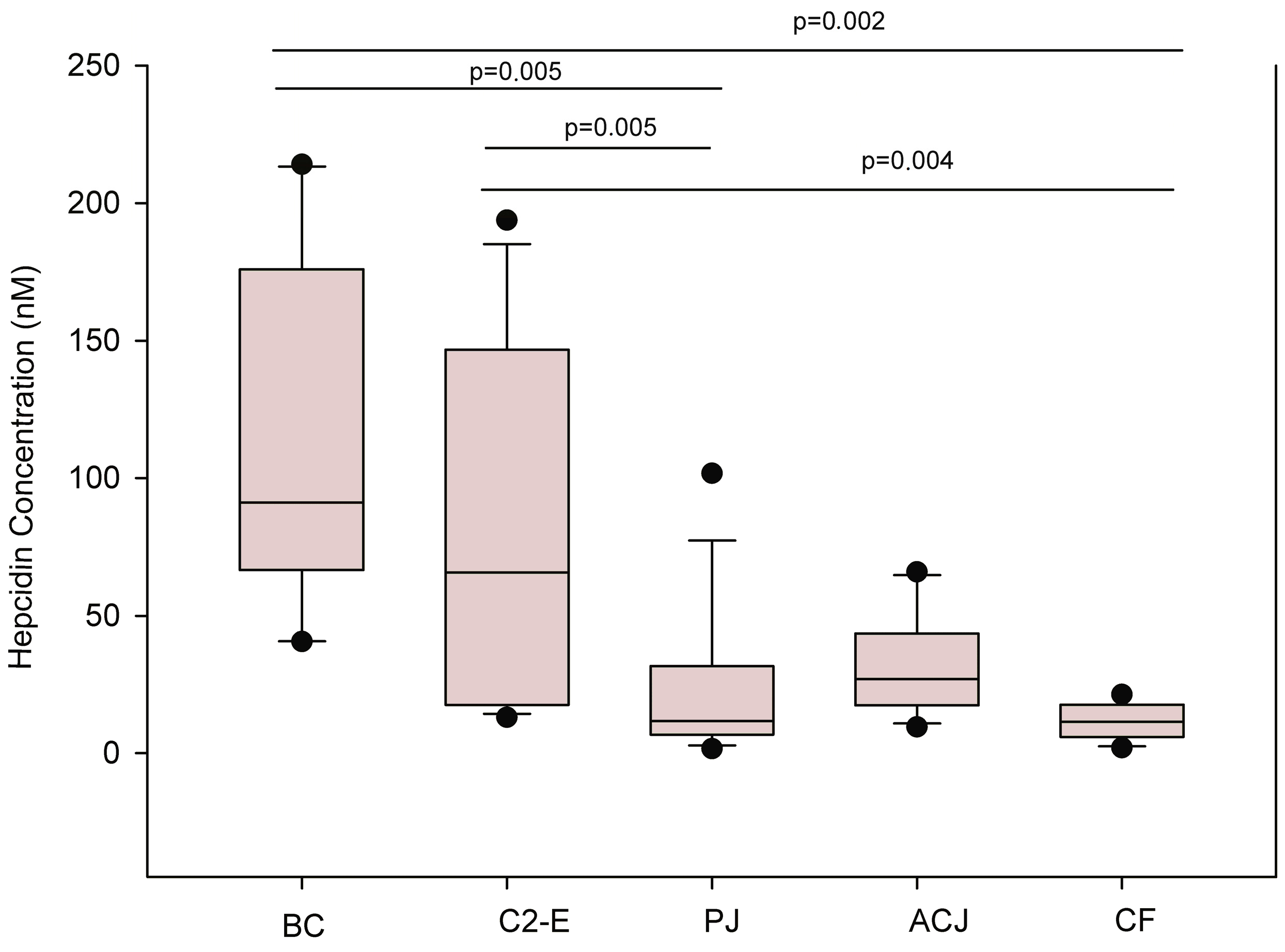 The Wilcoxon test revealed that the changes in hepcidin concentration were of statistical significance for the placebo treatment and baseline control (p = 0.005) and for the control 2-exercise (p = 0.005). The final control group showed statistical significance for the baseline control (p = 0.002) and for the control 2-exercise (p = 0.004). The aronia-citrus juice (ACJ) treatment produced a slight difference when compared to the baseline control and control 2, although non-significant differences were observed between the two test drinks.