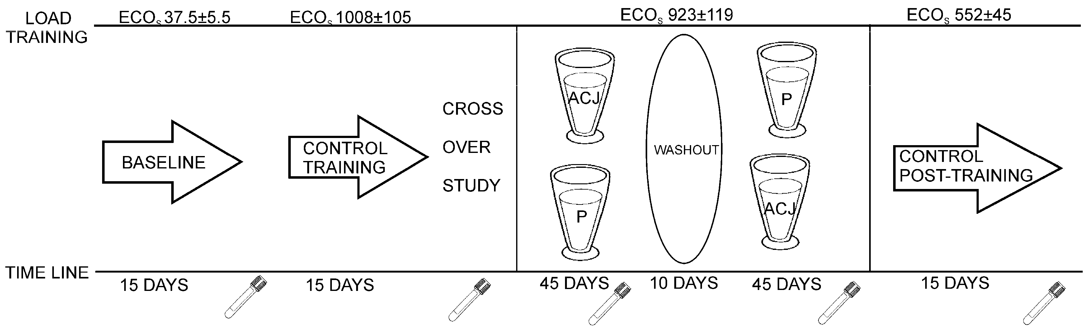 The study design has been described previously and approved for the determination of the influence of ACJ on the generation of DNA oxidation catabolites [27]. Plasma samples as controls were collected before the diet supplementation with ACJ. The first control, baseline plasma, was collected after 15 days of training with minimal ECO loads (37.5 ± 5.5). The second control plasma was collected after a 15-day training of increased ECO loads (1008 ± 105) and this increase in ECO load was maintained until the end of the study. In the next stage, with the dietary intervention, the subjects were randomly divided into two groups and supplemented with either 200 mL of ACJ or 200 mL of placebo drink per day, for 45 days. Every day the intake of the drink took place 15 min after the athletes had finished their training, in order to improve the bioavailability of the phytochemicals from the ACJ [15]. After each intervention, 10 days were utilized as a washout period without drink intake, but the training was maintained. Subsequently, the intervention protocol was repeated, swapping the two groups according to the corresponding drink intake while maintaining their training (same ECOs). Afterwards, there was an ultimate phase of the study: 15 days without supplementation and with decreases of ECOs (control post-treatment).