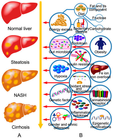 NAFLD initiates with aberrant accumulation of triacylglycerol (TG) in hepatocytes. Both increased input or synthesis of TGs and decreased output of TGs promote the progression of NAFLD. Increased input or synthesis of TGs includes increased dietary intake, increased lipolysis from adipocytes, and increased de novo lipogenesis in hepatocytes, which can be induced by hyperinsulinemia, hyperglycemia, obesity, and fructose ingestion [20,21,22]. Decreased output of TGs includes reduced β-oxidation in mitochondria, reduced extra-hepatic transport of TG in the form of very low-density lipoprotein (VLDL) [20]. Then, TGs accumulated in hepatocytes induce simple steatosis. Long-term hepatic steatosis can develop to NASH, the mechanisms of which include oxidative stress, maladjustment of the unfolded protein response, endoplasmic reticulum (ER) stress, lipotoxicity, and dysbiosis in gut [23,24,25,26]. Long-term hepatocyte death of NASH contributes to fibrosis. NASH-related fibrosis can lead to cirrhosis, and cirrhosis can develop into hepatic carcinoma (Figure 1A). Additionally, other factors also influence the progression of NAFLD, which have been briefly summarized in Figure 1B.