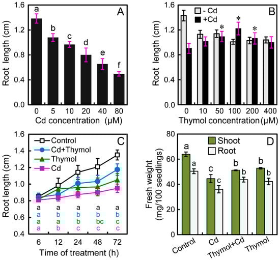 The effect of thymol on the growth of tobacco seedlings under Cd stress. (A) The roots of seedlings were treated with CdCl2 at 0–80 μM for 72 h for the measurement of root length; (B) In the presence of CdCl2 at 20 μM, the roots of seedlings were treated with thymol at different concentrations (0–400 μM) for 72 h. Then the root length was measured; (C) The roots of seedlings were exposed to 20 μM of CdCl2 and 100 μM of thymol simultaneously for 6, 12, 24, 48, and 72 h, respectively, for the measurement of root length; (D) The roots of seedlings were treated with water, 20 μM of CdCl2, 100 μM of thymol, alone, or their combinations for 72 h. Then the shoots and roots were harvested, respectively, for the quantification of fresh weight. Each value was represented as the mean of three replicates with SD. Different letters in (B) and (D) indicate that the mean values are significantly different between the treatments (p < 0.05, ANOVA, LSD). Different letters in (C) indicate that the mean values are significantly different among four treatments at a particular point in time (p < 0.05, ANOVA, LSD). The asterisk in (B) indicates that the mean value was significantly different between thymol + Cd treatment and Cd treatment alone (p < 0.05).